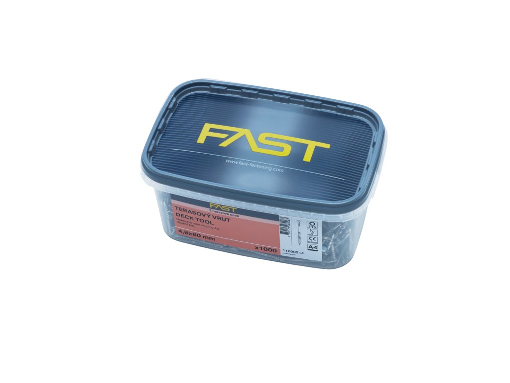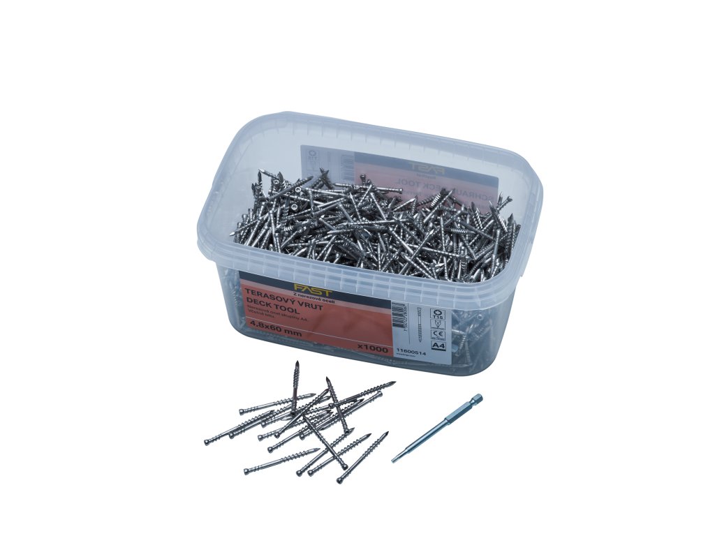 - Geometrie pro boční spoj: Hlava vrutu je zmenšená tak, aby hladce prošla vodícím pouzdrem nástroje FAST Deck Tool a zcela se zanořila do boku prkna.