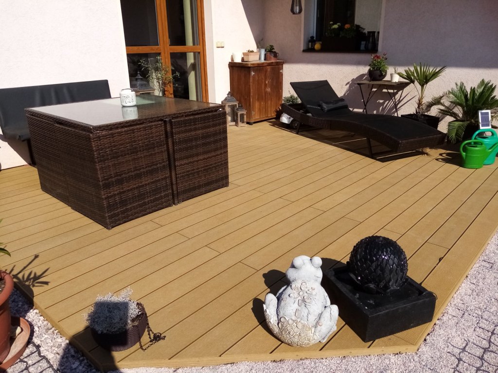 WPC terasa je skvělou alternativou pro klasickou dřevěnou terasu. Vzhledově je dřevu velmi podobná a nebudete ji muset natírat. Materiál je celobarevný a vysoce UV stabilní. V prvních 1–2 měsících může dojít k lehké změně barvy, ale poté už zůstane navždy stejná.